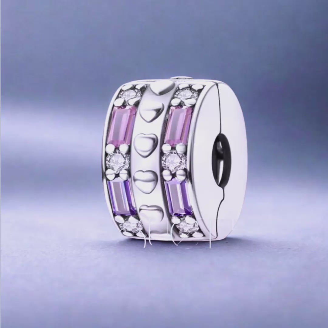 This elegant sterling silver clip charm is a handcrafted piece from our Silhouettes collection, designed to add a touch of romantic sparkle and subtle color to your customizable Pandora charm bracelet. Made of premium 925 sterling silver, it features a sleek, cylindrical band-style design that clips securely onto compatible Pandora bracelets, helping to space out and secure your other charms while preventing stretching.